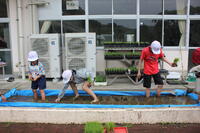 浦城小学校の田植えをしました。(学校の花壇が田んぼに変身)
