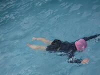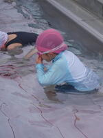 その後、全体で水に慣れる動きをたくさんやりました。1年ぶりではありますが、5年生は水にしっかり慣れていて様々な動きを上手に行うことができていました。1年生は、まずは水に慣れることを中心に学習しました。