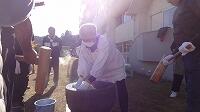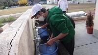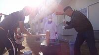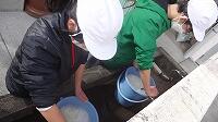 まずは、もち米をとぎました。約10㎏のもち米を4つに分けて、2.5㎏くらいずつバケツに入れてとぎました。5年生は家庭科で、ごはんとみそ汁の学習をしているので、お米をとぐ練習としてちょうどよい機会でした。お手本を参考に米をこぼさず手早くできました。1年生も先生と一緒に上手にできました。一晩水につけて吸水させます。