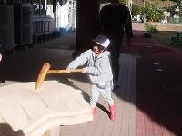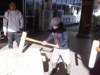 最後に、きねを持って、きねでつく練習をしてみました。持ち方から戸惑うような感じで恐る恐るのつき方でしたが、何回かつくうちに慣れてきて、形になってきました。今日の練習のつき方ができれば、うまくもちつきができそうです。