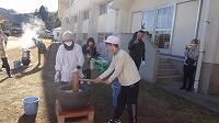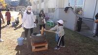 地域の方からもちつきの道具を借りて、たくさんの地域の方に来ていただき、もちつきをすることができました。最初は、お父さんや先生方で餅をこねたり、力強くついたりしました。地区のおばあちゃんがあいの手を入れてくださりもちがつき上がってきました。