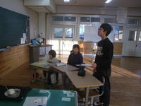 さっそく1校時は、しめ縄作りを一緒にしました。12月10日にはらわくでしめ縄作りをする予定ですが、その練習として行いました。浦城小には米作りのあとの稲わらがあるので、それを使いました。縄をなうのは力がいりますが、子どもたちと先生たちで協力して縄を作っていました。