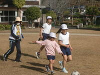 体育の時間は、元気よくサッカーを楽しんでいます。ドリブルでボールをキープしたり、ボールを取りに行ったり、ゴール前でシュートをしたりと、常に運動場を駆け回っています。たくさん動いて、上手になっていきますね。