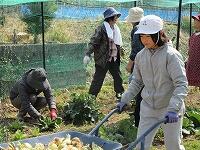 3月22日(金)の3校時に、空飛ぶ新玉ねぎなどの収穫をしました。地域の方にも呼びかけをしていたので、たくさんの方々がお見えになり、一緒に収穫作業をしていただきました。まずは、新玉ねぎを収穫しました。200個ほどあった玉ねぎは、あっという間に収穫されました。その後、小カブと春菊の収穫もしました。ちょうどよいくらいの大きさになっていたので、地域の皆さんも喜んで採ってくださいました。今年度の野菜の収穫はひとまず終わりです。1年間御協力ありがとうございました。