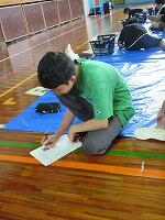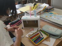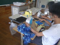 2年生は、新聞紙を使って、丸めたり、ひねったりして、作品を作りました。6年生は、クランクの仕組みを利用して作品を作ります。2人とも、海の中の様子をクランクの浮き沈みの仕組みと絡めて作っていました。