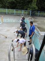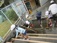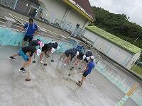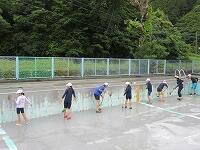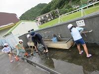 上学年は、プールの中を掃除しました。港小と合わせて7人で、かべをこすったり、底をみがいたりしました。7人で掃除するには、広いプールですが、一人一人がしっかり力を入れて掃除をしていました。その結果、プールのヌルヌルがほとんど取れて、とてもきれいなプールになりました。1・2年生もプールの周りをきれいにしていました。