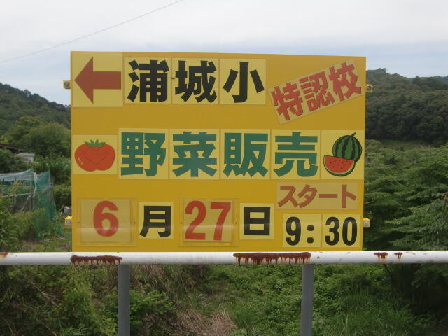 野菜販売の看板を付けました。国道沿いの学校入り口を示す看板に、野菜販売の看板を取り付ける作業を、6月19日(水)に行いました。技術員の先生の手作りの看板です。目立つように黄色をベースに作ってあります。国道を通る方々が見ていただき、足を運んでくださるとありがたいです。