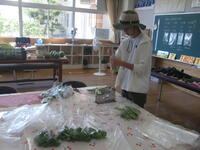 夏休みに入った初日の8月1日、野菜販売を行いました。子どもたちも登校してきて、普段通り、野菜の収穫から袋詰め、販売まで行いました。今回の販売品目は、トマト、きゅうり、ナス、ピーマン、オクラ、ねぎでした。ねぎは、夏野菜と一緒に植えていたものが大きくなったので、収穫して販売しました。いつものように、9時30分くらいから、番号くじを引いてもらい、その後、野菜を買っていただきました。10名ほどの方がお見えになり、野菜を買い求められました。おかげさまで、ほぼ完売でした。