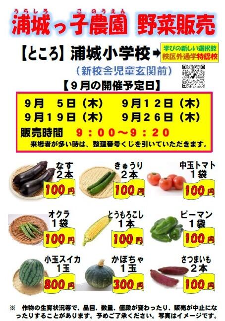 浦城小学校では、9月も野菜販売を実施します。日程は下記のとおりです。