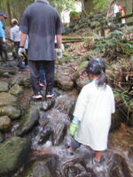 午後は、沢登りをしました。沢の水量は普段に比べるとかなり少なめだったようですが、子どもたちの膝下くらいでちょうどよい深さでした。短い距離ではありましたが、水の冷たさを感じながら元気に歩きました。