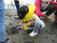 干潟体験では、河口付近の干潟に行って生き物の観察や採集をしました。カニやヤドカリなど小さな生き物がたくさんいて子どもたちは砂を掘っては捕まえていました。大きなカニが捕まると、その班にみんな見に行っていました。