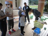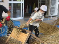 10月18日(金)、稲の脱穀作業を行いました。10月のはじめに刈り取っていた稲を、千歯こぎを使って脱穀しました。昨年もこの道具を使って作業をしているので、やり方はみんな分かっていました。しかし、1年ぶりの千歯こぎ、うまくわらを引けずにもみが落とせない様子が見られました。道具は使い方次第なので、どんなふうにしたらうまくもみが落とせるか、試行錯誤しながら作業しました。最後の方では、2年生も6年生もコツを得て、もみを落とすことができました。活動の終わりに、脱穀したもみの量をそれぞれ予想してから計量しました。わらが混じってはいましたが、3㎏ありました。2年生の予想が大当たりでした。