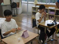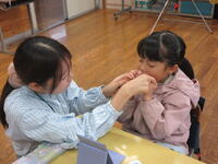 2年生は、初めて使うフロスに興味津々でしたが、なかなか上手に使えず養護助教諭と一緒に何度も使い方を練習していました。6年生は、フロスを使った経験があるようでしたが、慣れない手つきで鏡で口の中を確認しながら練習をしていました。