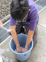洗濯の仕方に沿って進めていきました。洗剤の量を量り、洗濯液を作ります。その後、もみ洗いしてからしぼり、すすぎになりました。2~3回のすすぎのあと、しぼって干しました。手洗いについては、ほぼほぼ初めてだったので、よい経験となりました。洗濯液の洗剤の薄さに驚いていましたが、環境によいということも学習しました。