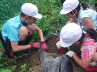 4月に植えたじゃがいもの収穫を行いました。1年生もじゃがいものくきを引っ張ったり、土の中からじゃがいもを掘り出したりしてがんばりました。