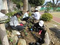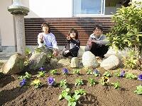 2月6日(火)の5校時に、パンジーの苗を花壇に植えました。技術員の先生が育ててくださっていた苗を花壇に定植です。紫や黄色の花の咲いた苗を自分たちで色合いを考えて場所を決めて植えていきました。