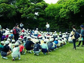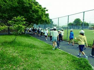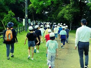 今回は、地震⇒津波を想定した訓練でした。まずは、緊急地震速報を聞いて一次避難で机の下に、二次避難で運動場へ避難しました。その後、津波からの避難として一ケ岡中央公園の高台まで移動し、帰校しました。
