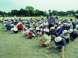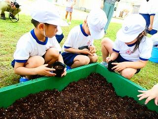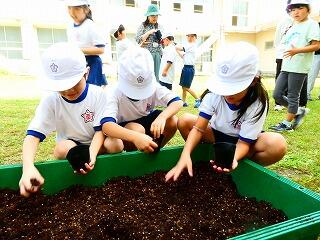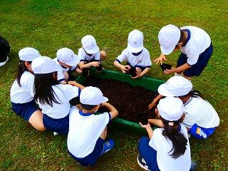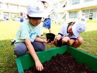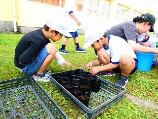 5月20日、1年生が生活科の学習で綿花の種子を植えました。