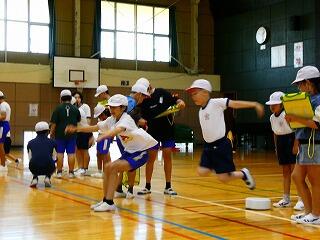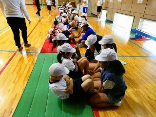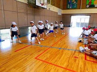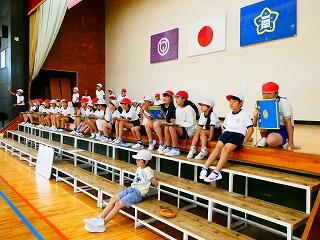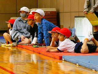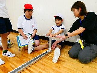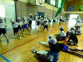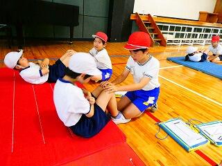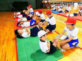 はじめて経験する種目でしたが、6年生と手をつないで移動し、6年生にやさしく教えてもらいながら、安心して取り組んでいた1年生。長座体前屈、反復横跳び、立ち幅跳び、シャトルラン、上体起こし・・・と盛りだくさんでした。6年生どうもありがとう!