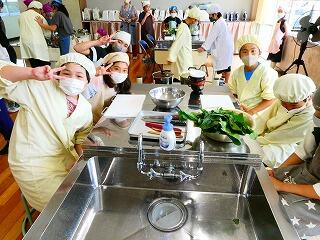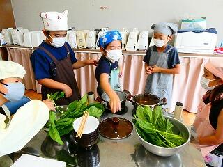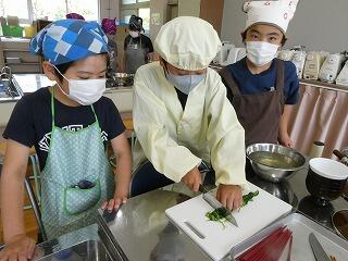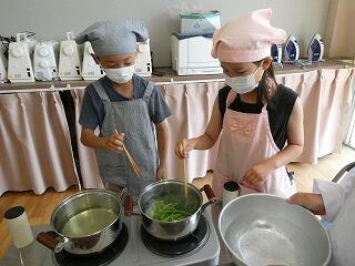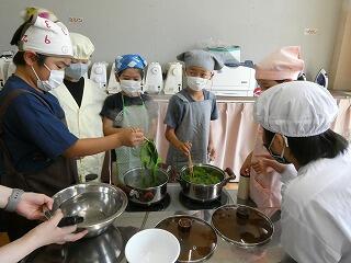 ガスコンロを使うのもはじめて、包丁で野菜を切るのもはじめて、その他いろんなはじめての経験があったことかと思います。調理手順は・・・お湯をわかす⇒青菜(ほうれん草)をゆでる⇒冷水で冷やす⇒ほうれん草の水気をしぼってとる⇒包丁で切る⇒器に盛り付けて調味料を加える です。やっぱり自分で調理したほうれん草はおいしかったようでした。