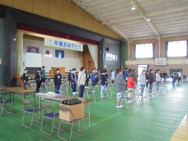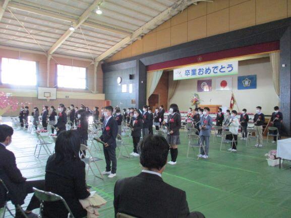 3月25日、保護者の方々と職員の待つ体育館に、担任とともに卒業生51名が入場してきました。卒業生の皆さん ご卒業おめでとうございます。開催が心配された卒業証書授与式でしたが、ウイルス感染防止対策を実施しながら、内容を短縮して開催することができました。ご理解をいただいたすべての方々に感謝申し上げます。学校長より、「将来に向かって道を切り開いていくとき、様々な困難(壁)にぶつかるかもしれない。そんなときこそ、知恵を出し合い、工夫して、仲間と協力して乗り越えてほしい。」と式辞がありました。輝かしい中学校生活が待っています、今後の健やかな成長をお祈りします。