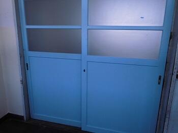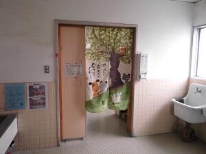 トイレのドアの開け閉めの時に、前後の子どもたちがけがをしたことが以前にあったようで、安全のため開け閉めできないようにひもで固定していましたが、この度、ドアを取り外し、のれんを付けて模様替えを行いました。