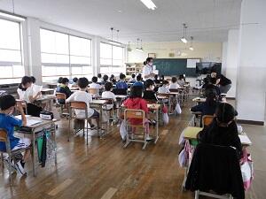 掃除では、縦割り清掃で、上学年の児童が下学年の児童にやさしく教えながら、無言掃除をしているところが多く見られました。