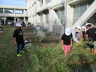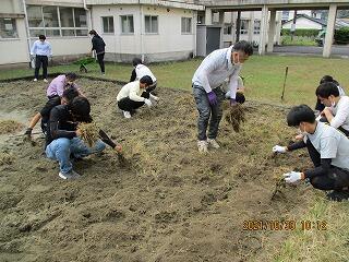 10月19日(火)の朝の時間は、クリーンタイムでした。中校舎の南側にある学級園の整備を行いました。この後、学校技術員さんに協力していただいて、耕耘機で耕し、肥料を入れます。