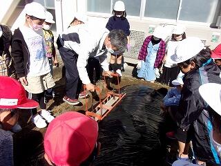 苗を初めて見た子どもたちは、小さいのにしっかりネギの匂いがしていることに驚いた様子でした。苗の植え方の説明を聞いた後、200本の苗を植えることができました。収穫は3月の予定です。みんなでお世話していきます。