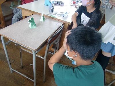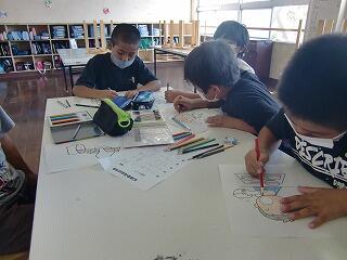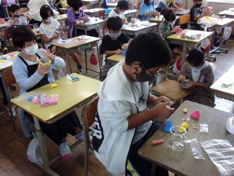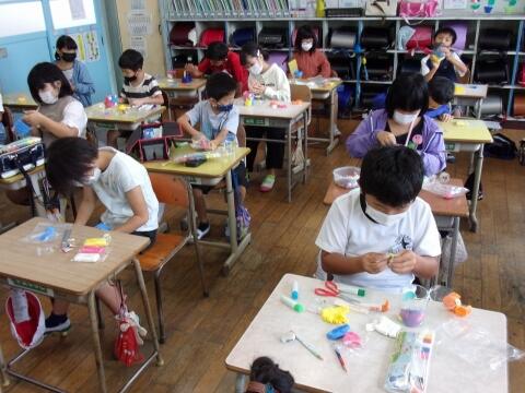 プラスチック容器の周りに色を付けた紙粘土をくっつけて、小物入れや貯金箱やペン立てを作りました。事前に設計図を作成して、イメージを膨らませておいたおかげで、個性豊かな作品が出来上がりました。