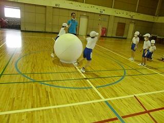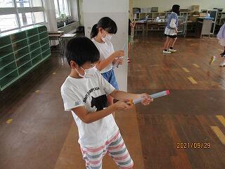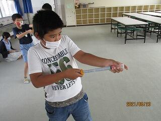 空気でっぽうで玉を飛ばして、空気の性質について考える授業です。