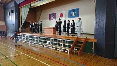 新任式では、新たに11名の職員を迎えました。始業式の校長の話では、今年度頑張ってほしいこととして、「集中力」と「協力」を示し、授業に集中してしっかりと学力を身に付けることと、友達と力を合わせて仲よく活動することを通して、素晴らしい学校にしていくよう子どもたちを励ましました。