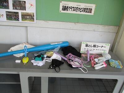 職員室前の棚の落とし物コーナーの写真などを見せながら、