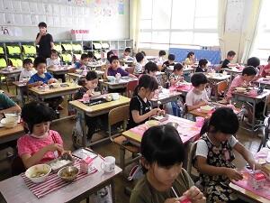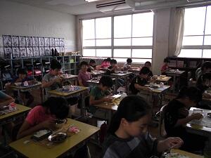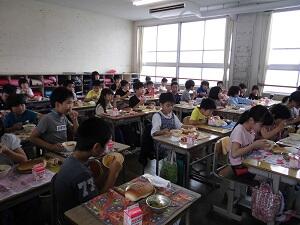 今日の給食準備時間に教室を回ってみると、5年2組が一番先に準備を済ませ、静かに食事をしていました。