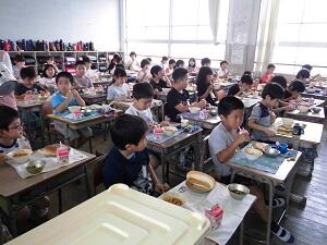 今日は、3年生、4年生の給食の様子を紹介します。感染症対策で友達とおしゃべりはできませんが、みんなもくもくと食べていました。