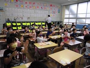 始業式では、2年生、3年生、5年生の3名の代表児童が2学期の目標などについて堂々と意見発表をしていました。その後、校長より2学期もコロナウイルスや熱中症に気を付けていくことや勉強や運動をがんばるために栄養と睡眠をよくとること、長い2学期、1ヶ月ごとにがんばることを決めて取り組むことについて話しました。