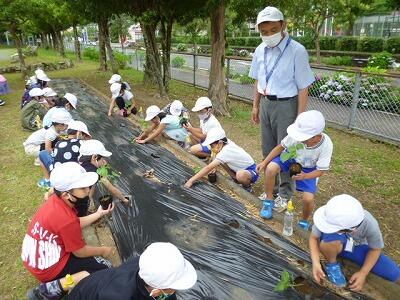 6月2日(水)に、コノハナロード延岡市民応援隊の方に協力していただいて、コットンの苗植えをしました。4月30日(金)に種を植えておよそ1か月。苗は20㎝くらいに育っています。