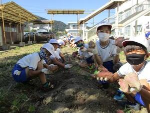 10月15日(木)に2年生が生活科の学習で芋掘りをしました。子どもたちは芋の周りの土を掘って見えてきた芋をくりくりと回しながら、友達と協力してたくさんの芋を収穫しました。作物を育てる苦労や収穫の喜びを感じることができました。