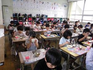 次は、1年生と2年生の食事の様子です。感染症対策でグループは作れませんが、前を向いていっしょうけんめい食べていました。