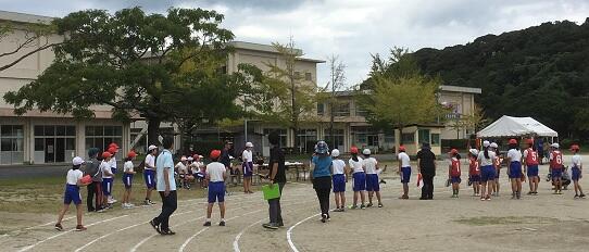 一旦、学年ごとに全校朝会の隊形で整列して、地区ごとに集合・整列して、校長先生と担当の先生のお話を聞きました。