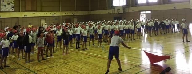 昨日からの雨による運動場のコンディション不良のため、本日に延期となった合同体育の3回目が、いちおかタイムから1校時にかけて、運動場が使えないため体育館にて行われました。