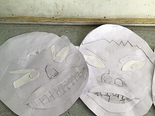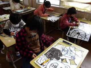 1年生は、図工の時間に、紙版画を作成中です。タブレットで自分を撮影し、人間がどのような形をしているかを確認しながら描いています。今日は、顔と手を完成させました。眉毛の形や目を工夫して、表情豊かな顔を作成することができました。
