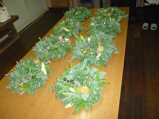 円形の骨組みに少しずつ葉っぱをしばりつけ、最後にグルーガンで木の実などを接着します。わずか2時間ほどの作業でしたが、おしゃれなリースができあがりました。