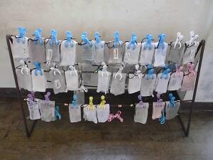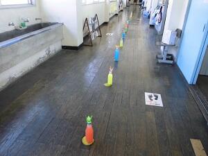 5年生が国語で、自分たちの課題を見付け解決するという学習をしたそうです。その中で自分たちの課題は「廊下歩行」だということになり、改善策として思い付いたのがこの方法だそうです。ペットボトルに色水を入れ、上に折り鶴が付けてあります。折り鶴には「倒さないように」と「廊下歩行がよくなりますように」という思いが込められているそうです。