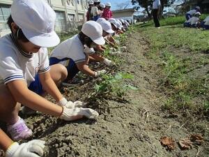 10月15日(木)に2年生が生活科の学習で芋掘りをしました。子どもたちは芋の周りの土を掘って見えてきた芋をくりくりと回しながら、友達と協力してたくさんの芋を収穫しました。作物を育てる苦労や収穫の喜びを感じることができました。
