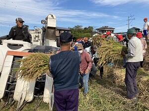 と、初めての稲刈り体験を楽しんでいました。2分の1ほど鎌で刈った後は、コンバインの登場です。速いスピードで刈り取りながら脱穀する様子に子どもたちの目はくぎ付けでした。JAの方々、農家の皆さん、貴重な体験をさせていただき、ありがとうございました。