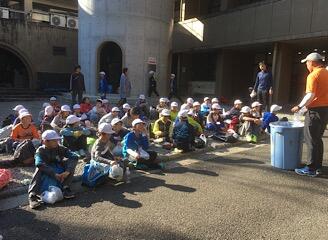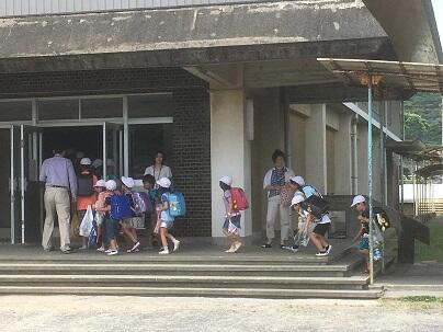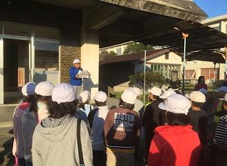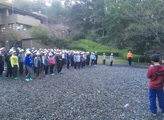 一旦、学年ごとに全校朝会の隊形で整列して、地区ごとに集合・整列して、校長先生と担当の先生のお話を聞きました。