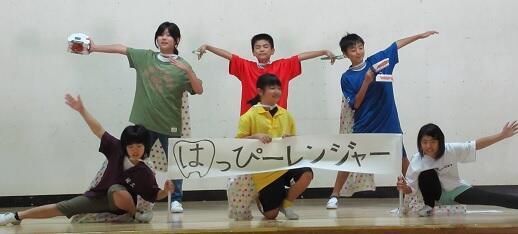 5年生が扮する”は”っぴーレッド、”は”っぴーグリーン、”は”っぴーパープル、”は”っぴーイエロー、”は”っぴーブルー、”は”っぴーホワイトの6人が「むし歯治療率70%以上」達成のためのアピールを行いました。
