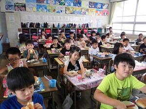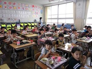 5年生が給食の配膳をしているときに、全員が無言できちんと座って待っています。