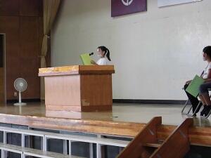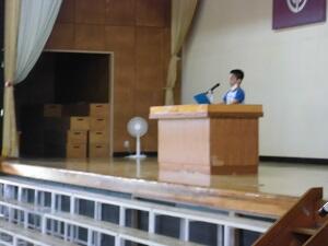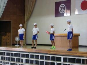 次に、終業式の様子です。はじめに6年生の代表の人が1学期を振り返って意見発表をしてくれました。堂々と発表していました。